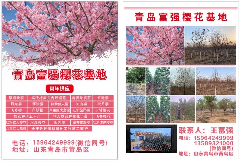 山東青島富強(qiáng)櫻花苗木基地歡迎您(王富強(qiáng) 13780680000、13589321000),青島富強(qiáng)品種櫻花基地常年供應(yīng):早櫻晚櫻,高低桿染井吉野櫻花,陽光櫻,河津櫻,紅粉佳人櫻,關(guān)山櫻,大漁櫻,松月櫻,飛寒櫻,白妙櫻,美利堅櫻,紅花染井吉野櫻,八重紅大島櫻,江滬彼岸櫻,小松乙女櫻,思川櫻,紅山櫻,雅櫻,獎?wù)聶眩酥丶t垂枝櫻等占地櫻花,承接各種園林綠化工程施工養(yǎng)護(hù)。歡迎新老客戶來我們這邊考察,購苗買苗服務(wù)。